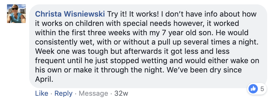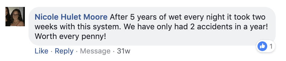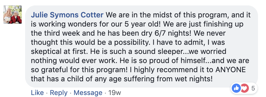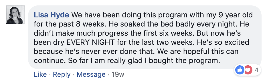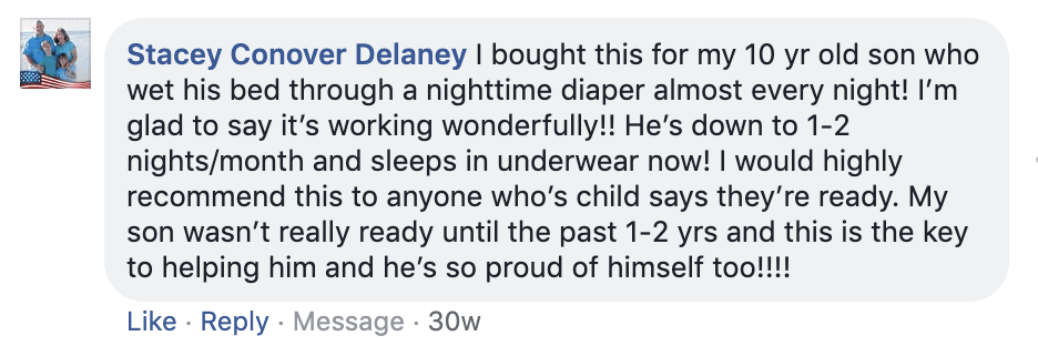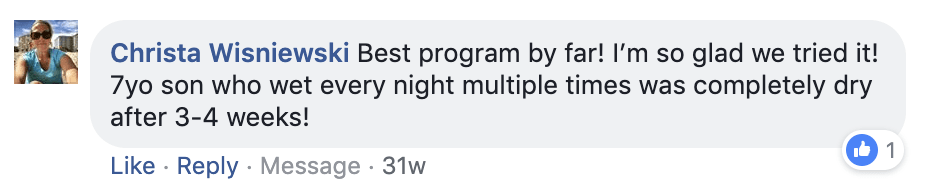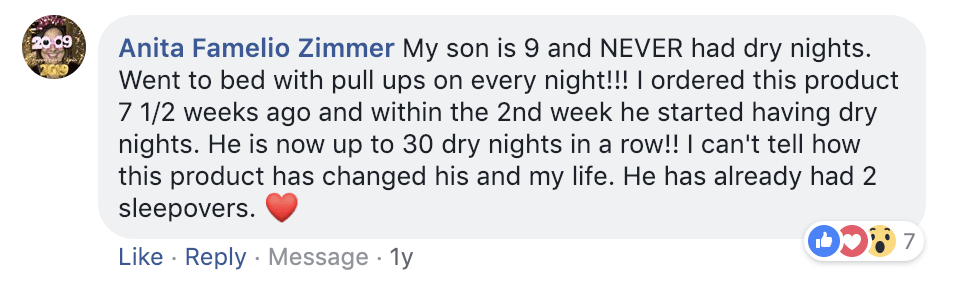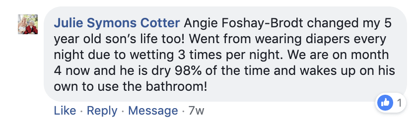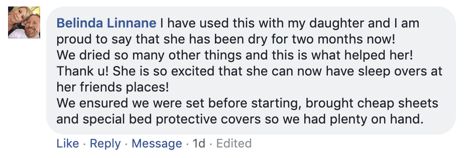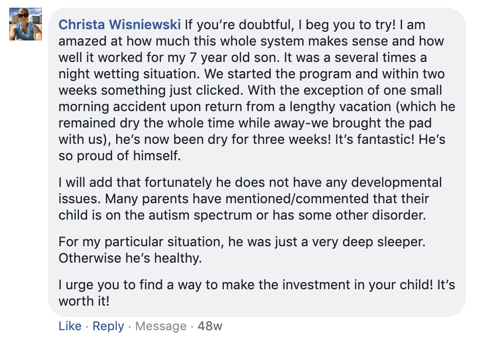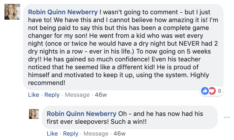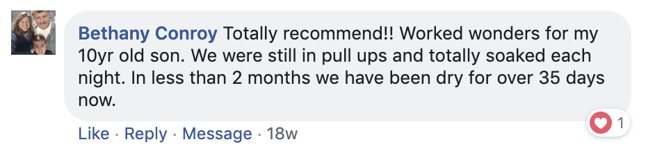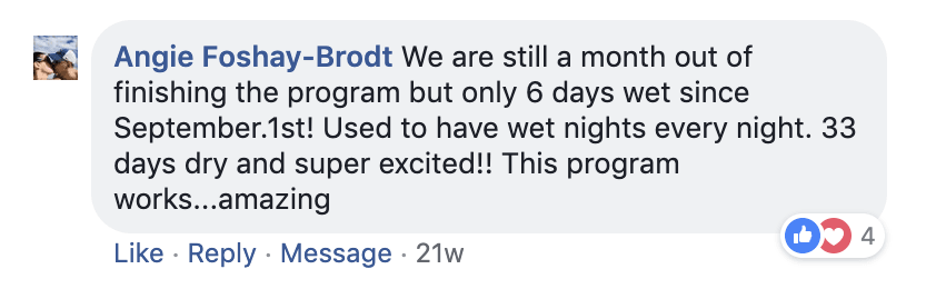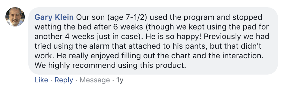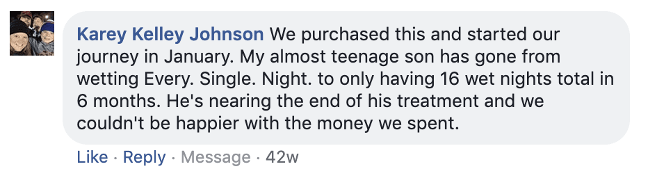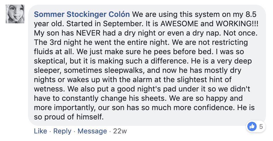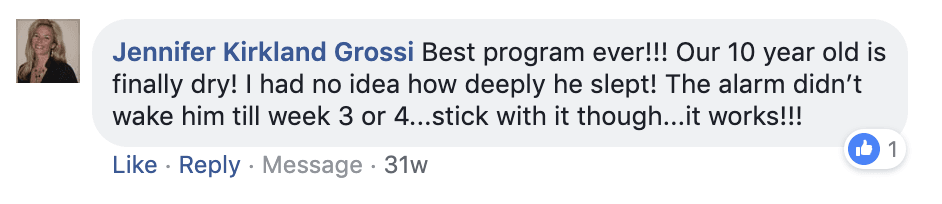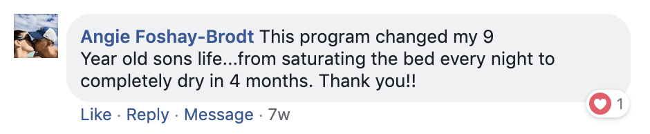“…I wanted to let you know that Josh has had 30 straight dry nights! I can’t thank you enough for your help with this! He is looking forward to his first sleepover!!!…”