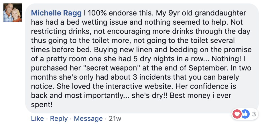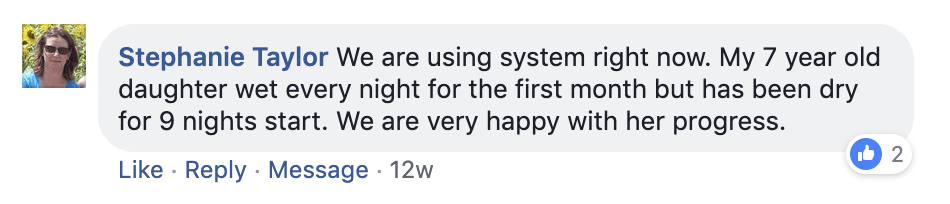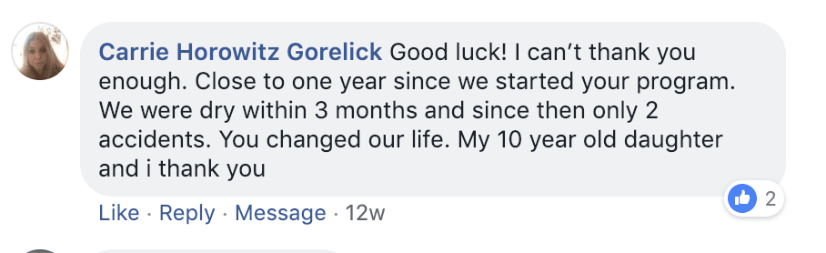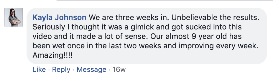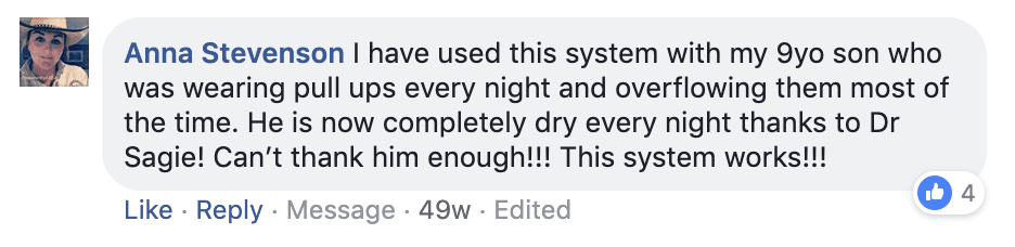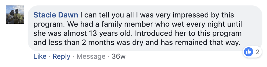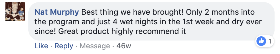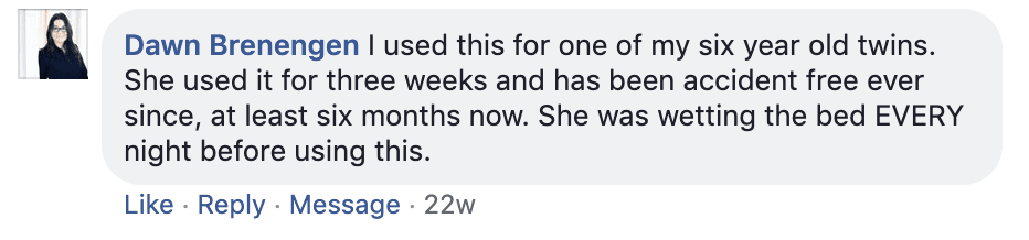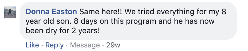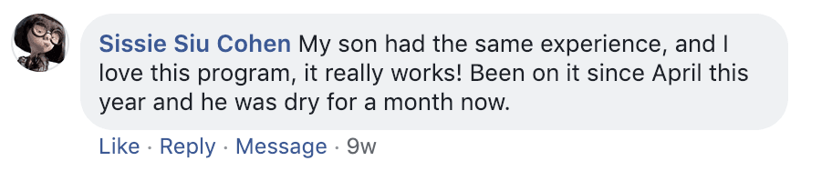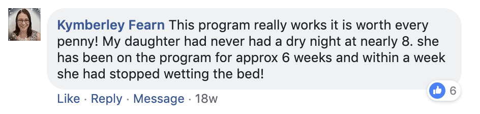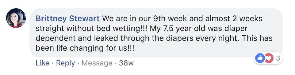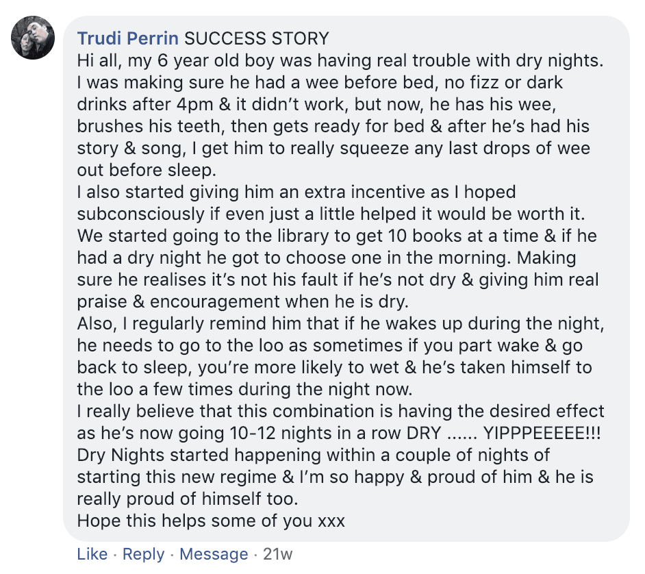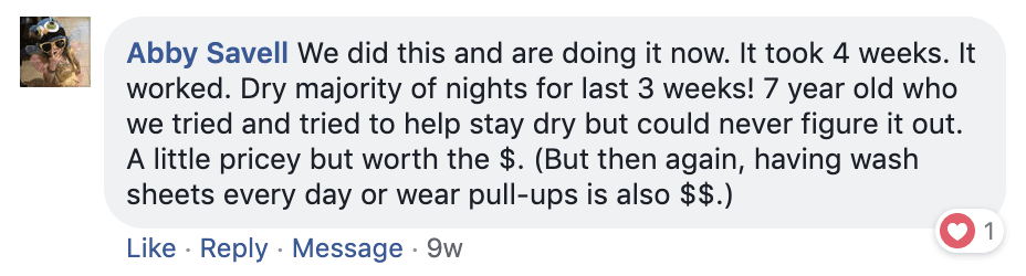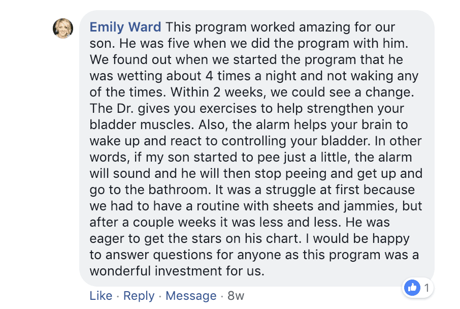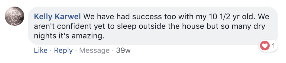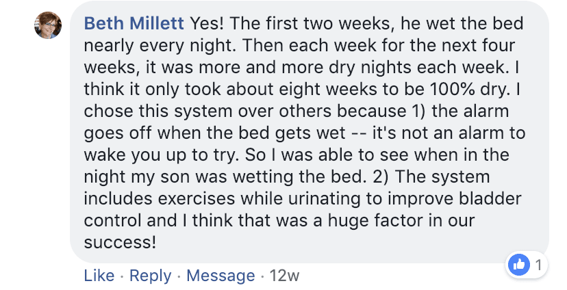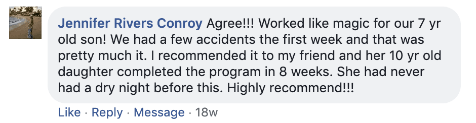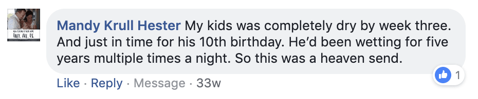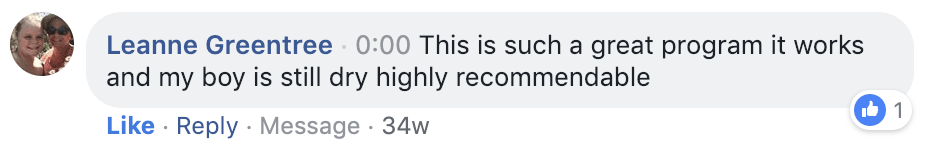 “…I wanted to let you know that Josh has had 30 straight dry nights! I can’t thank you enough for your help with this! He is looking forward to his first sleepover!!!…”