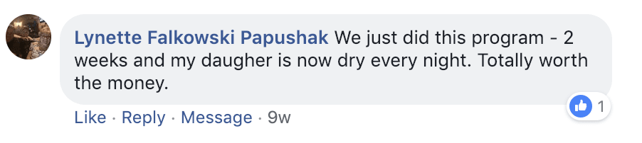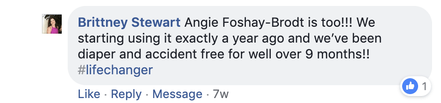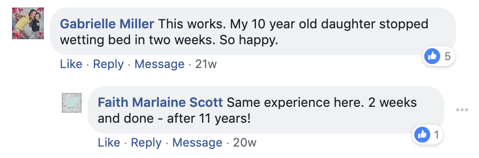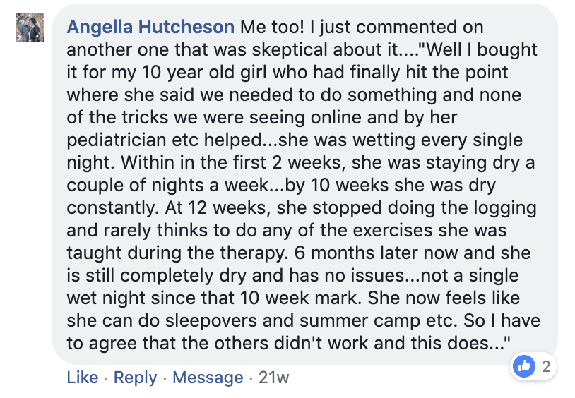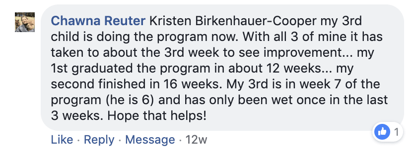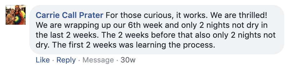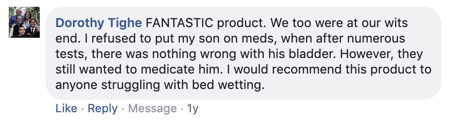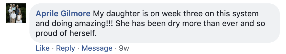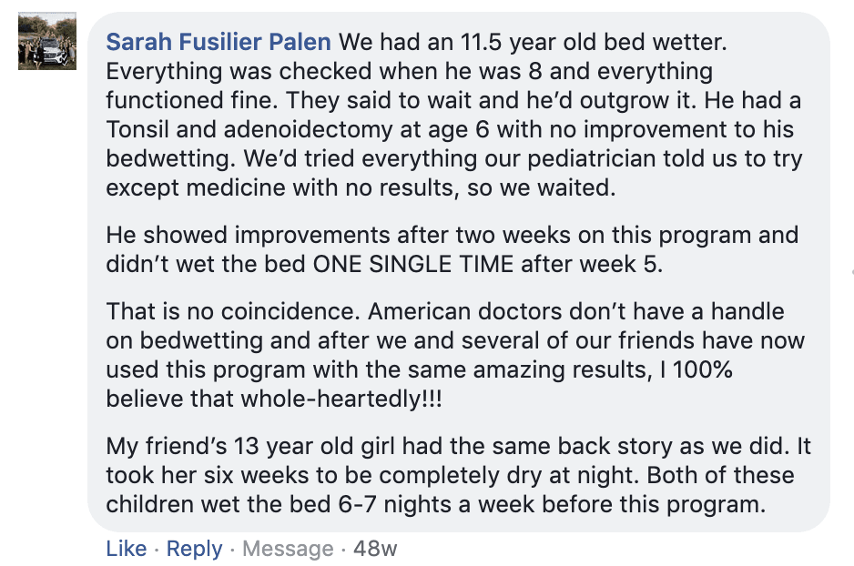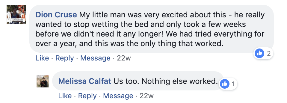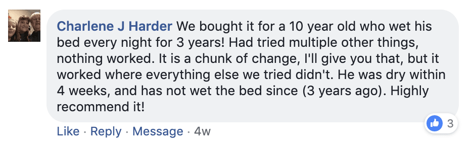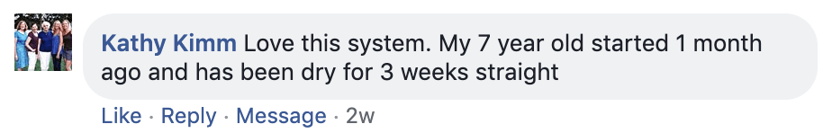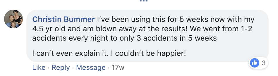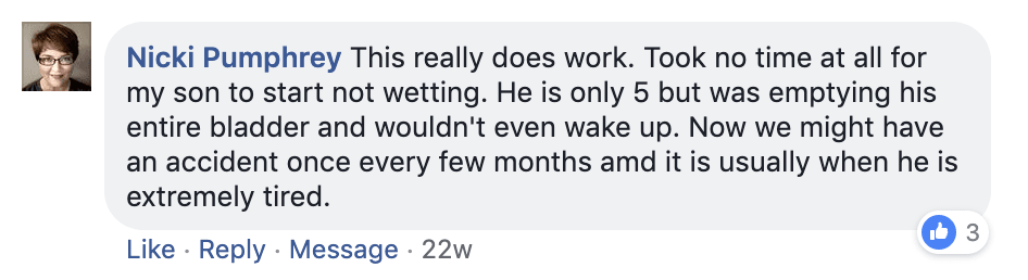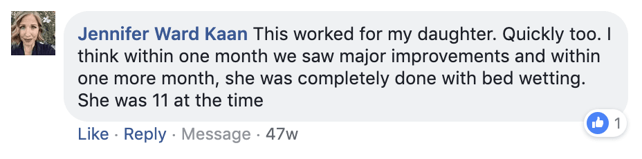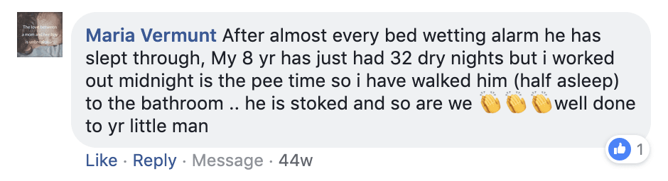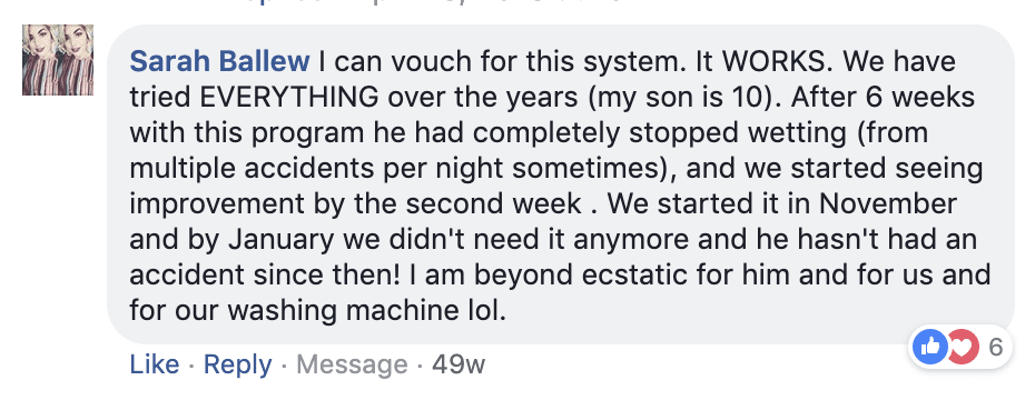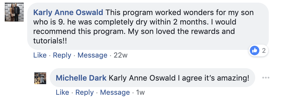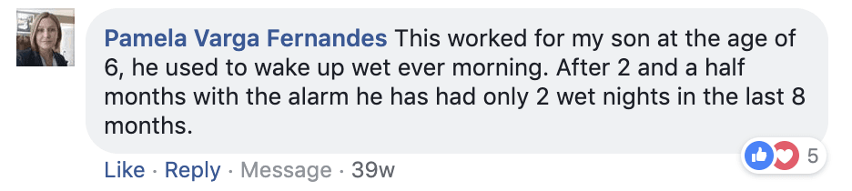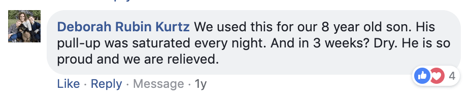 “…I wanted to let you know that Josh has had 30 straight dry nights! I can’t thank you enough for your help with this! He is looking forward to his first sleepover!!!…”