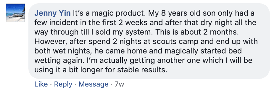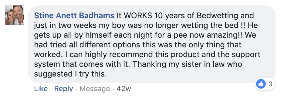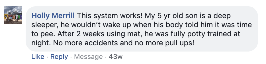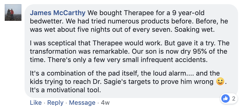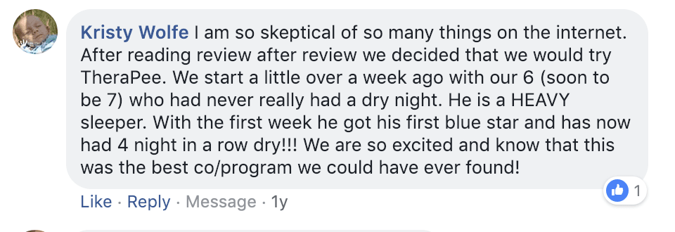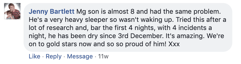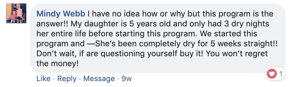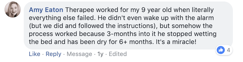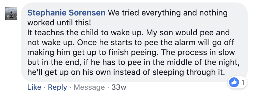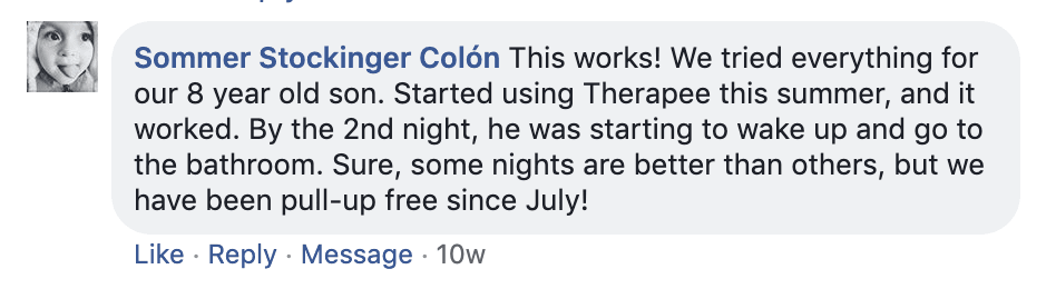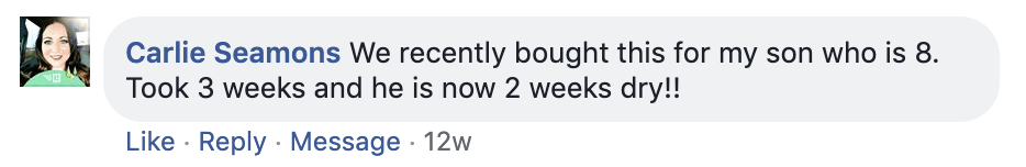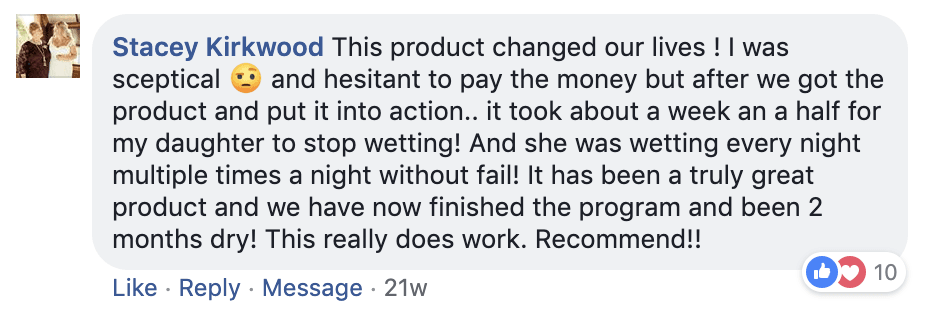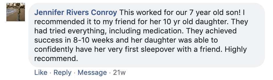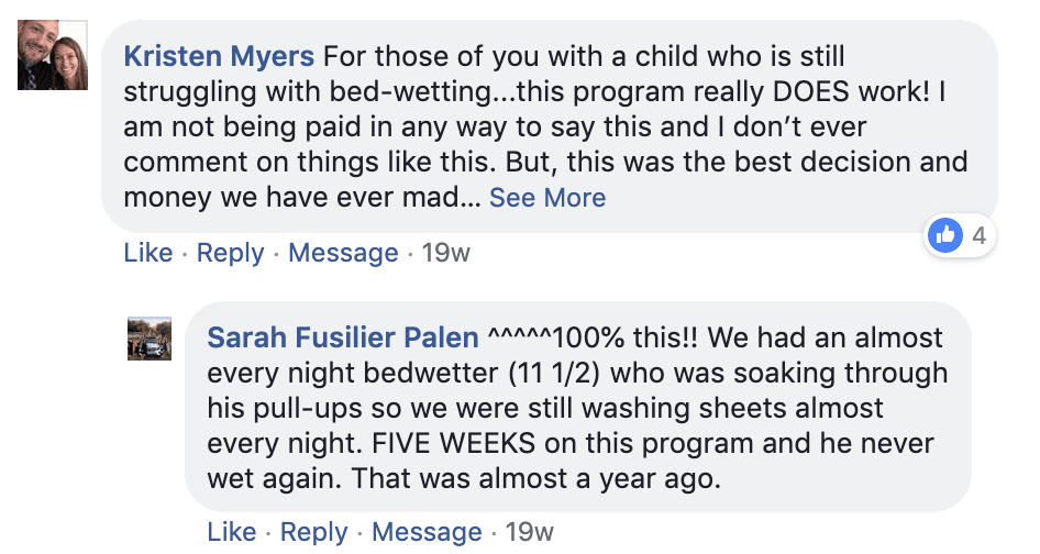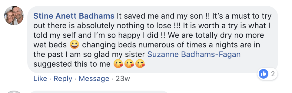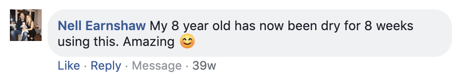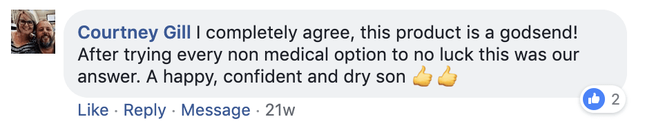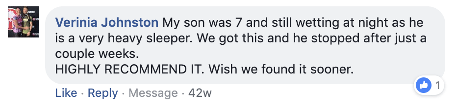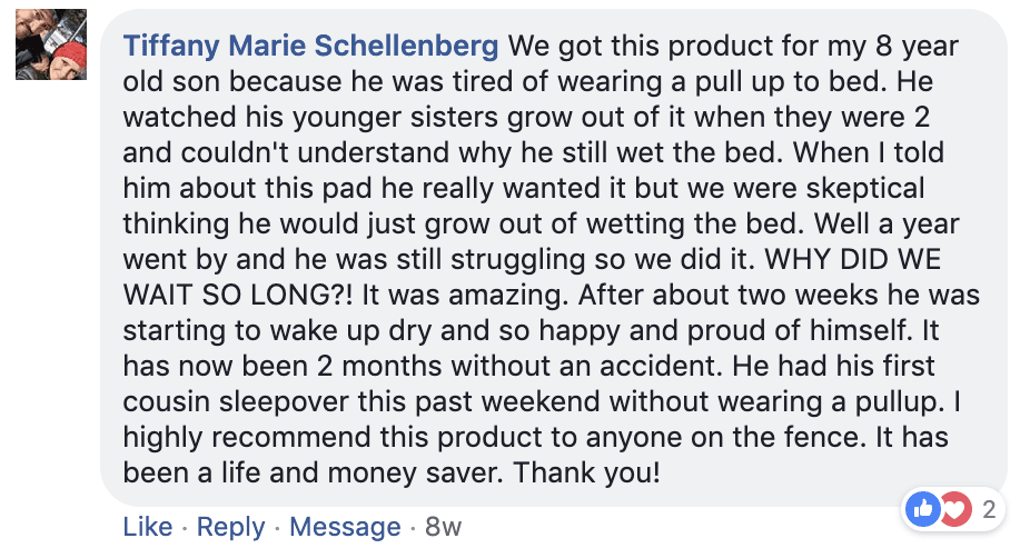 “…I wanted to let you know that Josh has had 30 straight dry nights! I can’t thank you enough for your help with this! He is looking forward to his first sleepover!!!…”