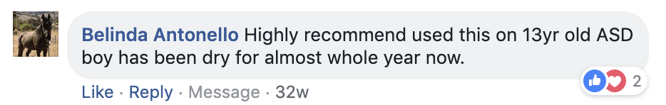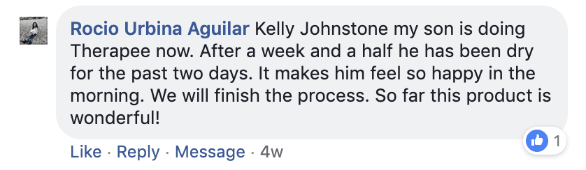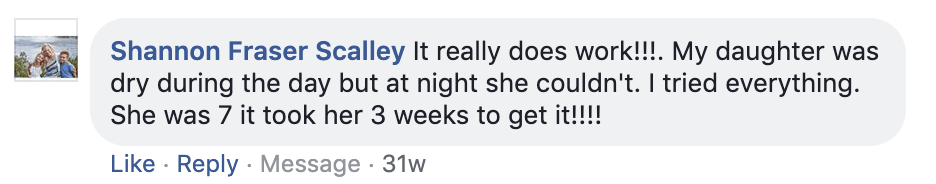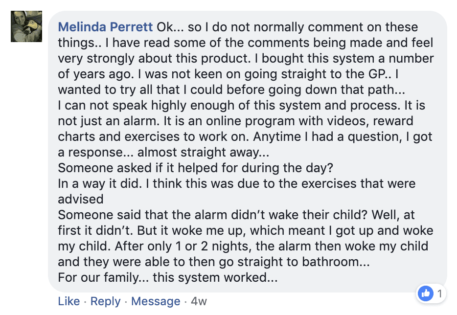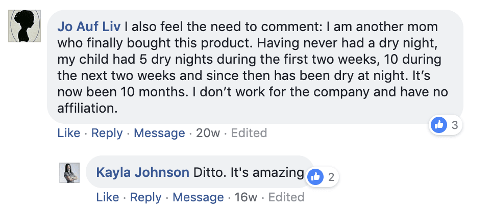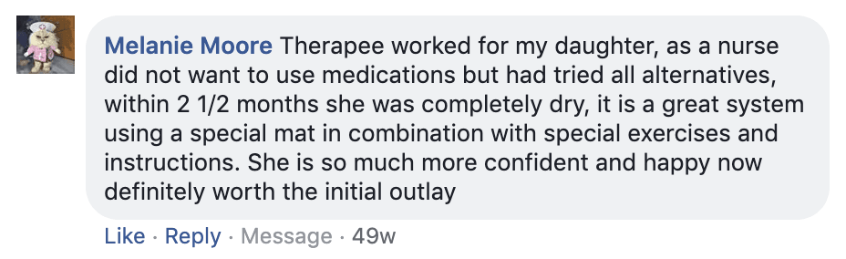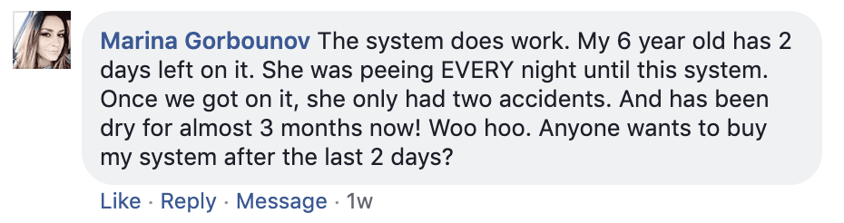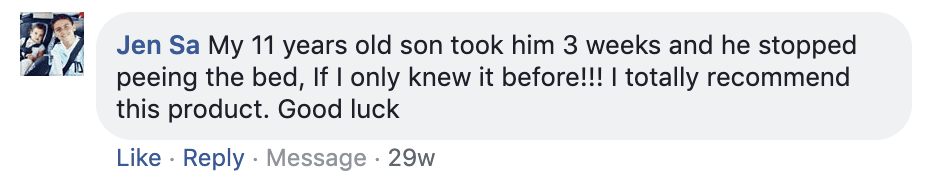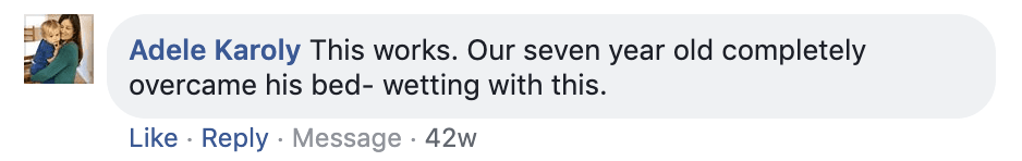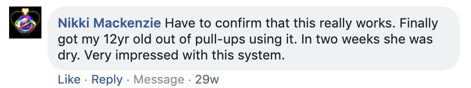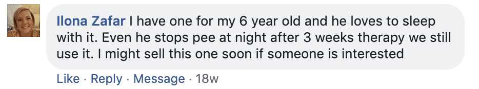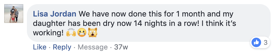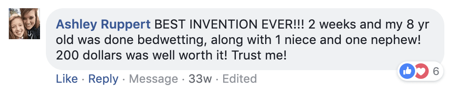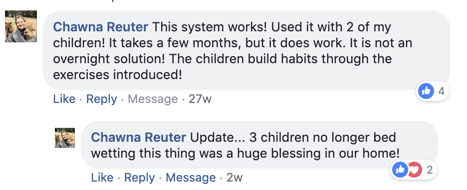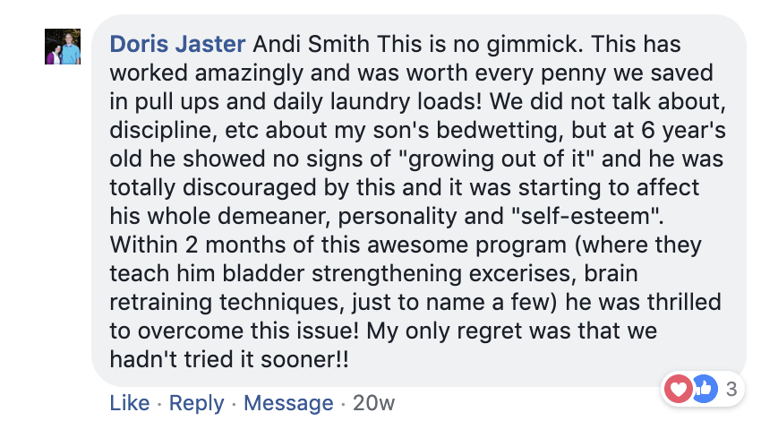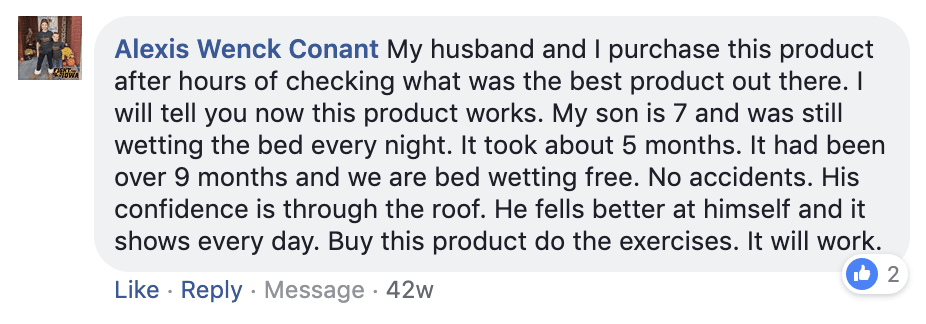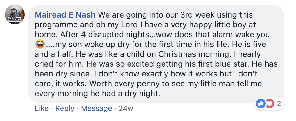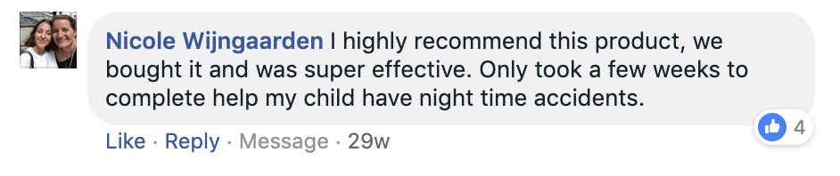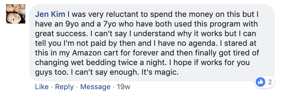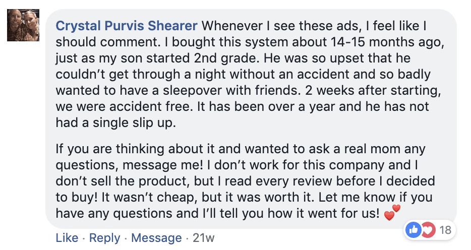 “…I wanted to let you know that Josh has had 30 straight dry nights! I can’t thank you enough for your help with this! He is looking forward to his first sleepover!!!…”